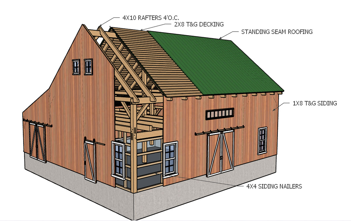 • Bent rafters / typically 8×12’s at each post location with 6×8 or 6×10 cross purlins