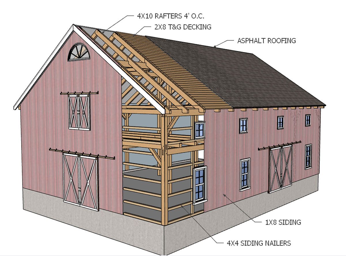 - Bent rafters / typically 8×12’s at each post location with 6×8 or 6×10 cross purlins